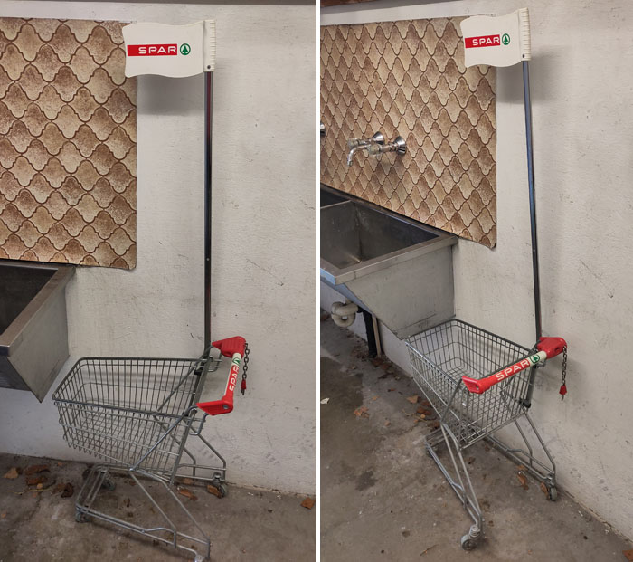 Vielen Dank an Blogleser Robert für die Zusendung dieser Bilder. Diesen kleinen Kindereinkaufswagen mitsamt Fahne und sogar Münzschloss hat er in einem Abstellraum für Winterausrüstung auf einem Campingplatz in Schruns / Vorarlberg gefunden.