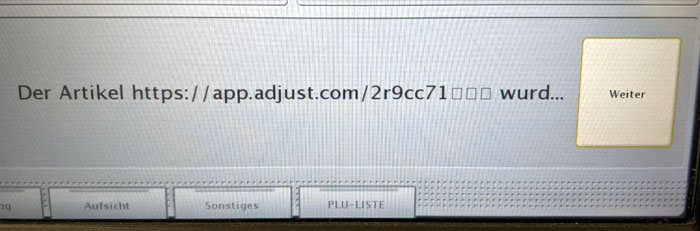 Ein bisschen doof guckte ich schon aus der Wäsche, als mir während eines Kassiervorgangs auf dem Display meiner Kasse angezeigt wurde, dass ein Artikel nicht gefunden wurde. Das alleine war kein Grund für den sparsamen Gesichtsausdruck, das kommt öfter mal vor, aber statt einer Artikelnummer wurde mir dort offenbar eine URL anzeiget: "https://app.adjust.com&2r9cc71 …" stand dort – und mir ein großes Fragezeichen im Gesicht.