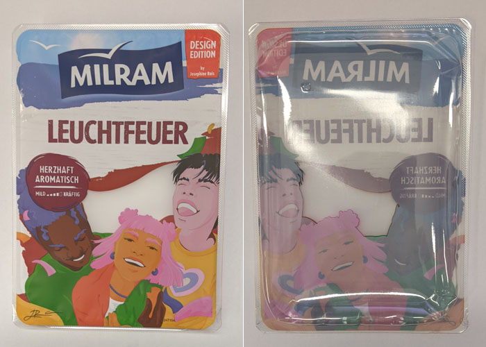 Eine Packung "Leuchtfeuer"-Käse von Milram. Diese Packung ist nicht nur divers gestaltet, sondern auch ihr Inhalt nimmt Rücksicht auf die unterschiedlichen Bedürfnisse der Kunden: Auf Diät? Passt. Laktoseunverträglichkeit? Passt. Vegetarisch, sogar vegan? Passt. Fettfrei? Passt. Zuckerfrei? Passt. Glutenfrei? Aber sowas von! Leider ist die Packung nicht auch noch plastikfrei, aber wenn man dieses Produkt an der Käsetheke holt, ist man auch diesbezüglich auf der richtigen Seite.