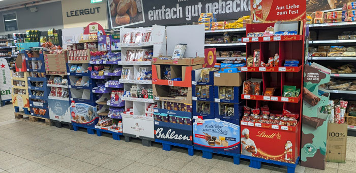 Macht aber nichts, wir sind mit der Technik seit Jahren schon ganz erfolgreich und im Laufe der Vorweihnachtszeit verdichten wir die Artikel immer mehr und nach und nach rücken immer mehr von den weihnachtlichen Displays vor das Brotregal.