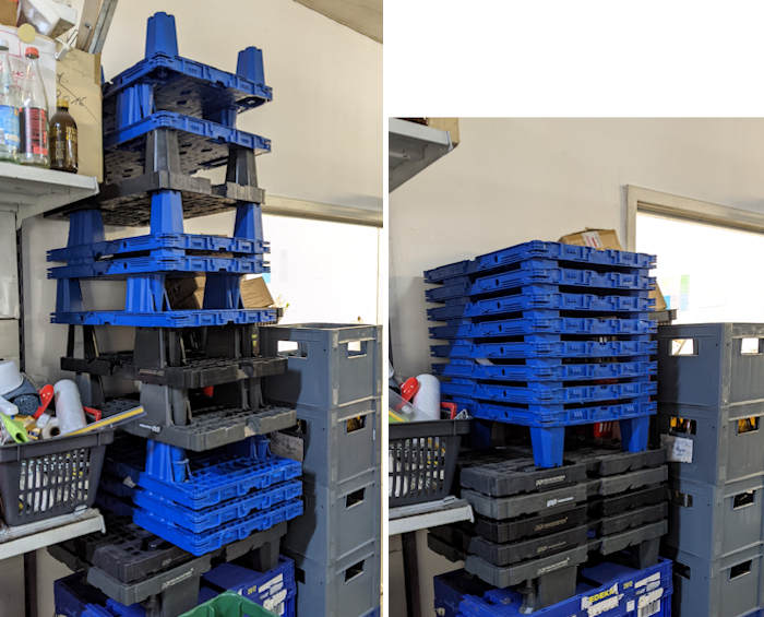 Wie auch immer, man kann die Paletten entweder so wie im linken Bild stapeln und damit nicht nur eine U(m/n)fallgefahr provozieren, sondern auch noch unnötig Platz verbraten – oder man stellt sie eben so wie im rechten Bild ordentlich in- und übereinander.