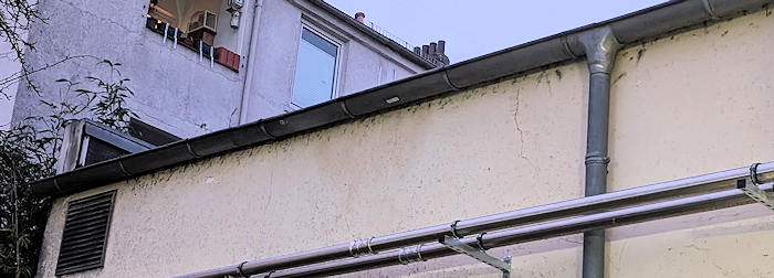 Nach einiger Suche entdecke ich eine mögliche Ursache: An der Außenseite des Gebäudes prangt genau an der Rückseite des Flecks eine offenbar nasse Stelle. Ziemlich genau in der Bildmitte der dunkle Halbkreis. Da die Rundung nach unten zeigte, tippte ich auf von oben durch das Dach eindringendes Wasser und so beauftragte die Hausverwaltung schnell einen Dachdecker für eine Begutachtung.
