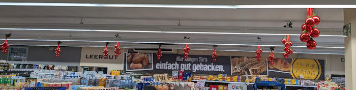 Ich hatte überhaupt keinen Bock, diese borstigen Draht-Tannengirlanden stundenlang auseinanderzufalten und hier im Laden aufzuhängen. Damit überhaupt irgendetwas hier hängt, haben wir zumindest die roten Weihnachtskugeln an der Decke verteilt.