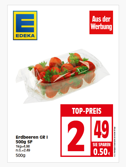 Seit dieser Woche schon haben wir also die Fensterplakate mit Produktabbildung im Einsatz, jedoch mit weißem statt mit Schiefertafel-Hintergrund, was natürlich Unmengen an Toner spart. Unten seht ihr eines der Plakate für die kommende Woche, bei EDEKA sind Erdbeeren aus Griechenland für 2,49 € im Angebot. Also kauft!