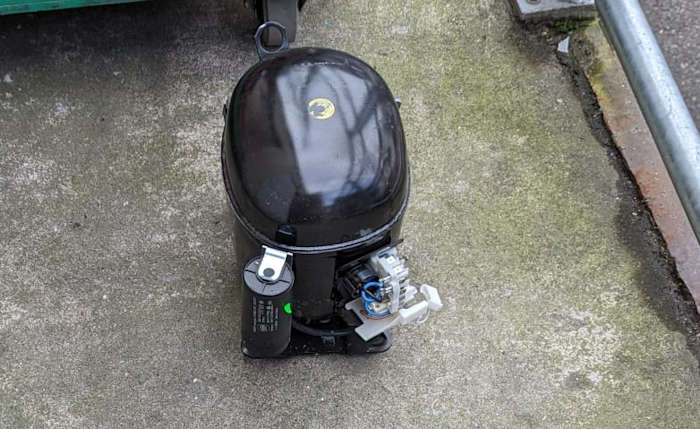 Der alte Kompressor stand zeitweile bei uns hinten auf der Rampe und hat auf seinen Abtransport gewartet. Ines hatte die Gelegenheit für einen Schnappschuss genutzt und mir dieses Bild geschickt. Diese kleinen Kapselkompressoren halten normalerweise ewig, zumindest bei jedem dödeligen Kühlschrank in der heimischen Küche. Seufz …