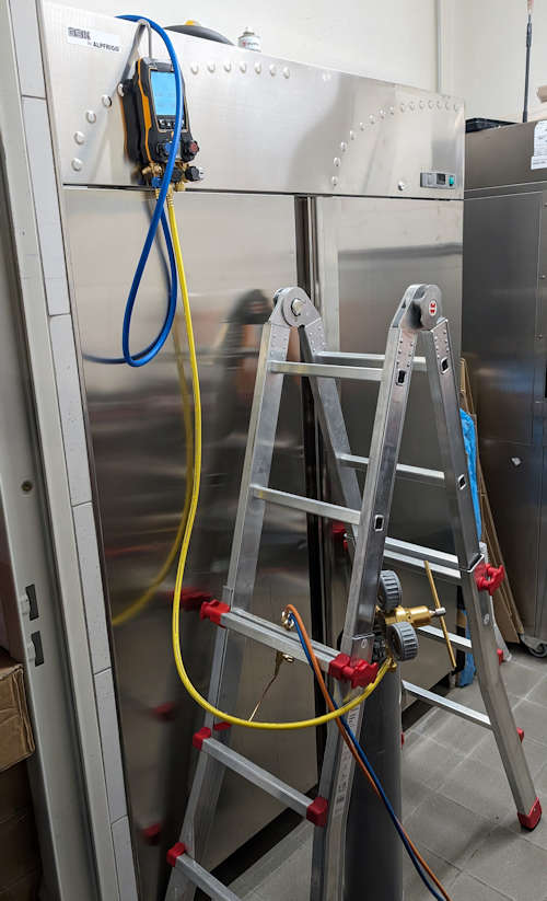 Im Laufe des Nachmittags hat sich übrigens ein Techniker um unseren Tiefkühlschrank gekümmert und den neuen Kompressor eingebaut. Viele spektakuläre Fotos gab es davon gar nicht, die meiste Zeit war irgendein Gerät damit beschäftigt, Kältemittel abzusaugen, ein Vakuum herzustellen oder eine Druckprüfung vorzunehmen. Die Pumpen brummten und der Rest passierte unsichtbar in den Rohren und Schläuchen.