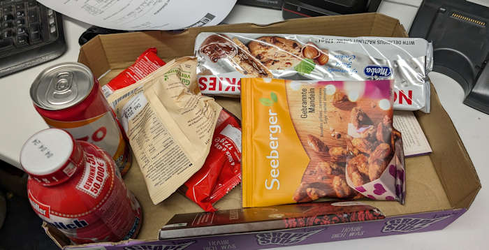 Wir beobachteten fasziniert, denn er hatte keine Taschen dabei und machte auch keine Anstalten, die Sachen irgendwo in seiner Jacke zu verstauen, sah aber dabei so ganz und gar nicht nach einem Kunden aus, der sich diese Produkte leisten kann. Aber manchmal haut man mit Vorurteilen ja auch mal daneben. Der Mann ging in die Getränkeabteilung und fing plötzlich an, irgendwas umzusortieren. Leider in dem Moment mit dem Rücken zur Kamera, aber wir wussten ja, was er genommen hatte und was sich nach dieser Aktion noch in seinen Händen befinden sollte. Zu unserer Überraschung hatte er einen leeren Getränkedosenkarton genommen und dort die Artikel deponiert. Es folgten noch eine Dose Cola, Nüsse, Mandeln, Kekse – alles Markenprodukte im Gesamtwert von über 20 Euro: