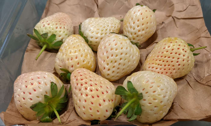 Zumindest die probierten vom Foto schmeck(t)en etwas weniger süß als die knallroten Beerenkollegen, mit geschlossenen Augen wäre mir jedoch kein wesentlicher Unterschied aufgefallen. Nennenswert "ananassig" fand ich das Aroma jedenfalls nicht, sie sind aber etwas fester. Sie sind auf jeden Fall ein Hingucker, wenn man sie als Alternative zu den knallroter Beeren verwendet: