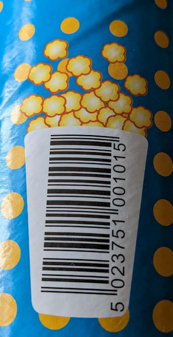 Diesen Strichcode mit einem offenen Popcornbecher (oder einer "Big Bang"-Dose), aus dem das Popcorn wild herausfliegt, hatte Susanne auf einer Dose "BANG BANG" Popcorn in der Sorte Butter/Coconut entdeckt. Vielen Dank für die Zusendung.