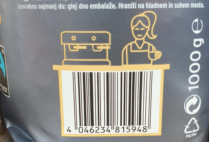 Diesen Strichcode als Tresen, auf dem eine Siebträgermaschine und hinter dem eine Barista mit Schürze steht, hatte Blogleser Falk auf einer Packung Kaffeebohnen von Tchibo entdeckt.