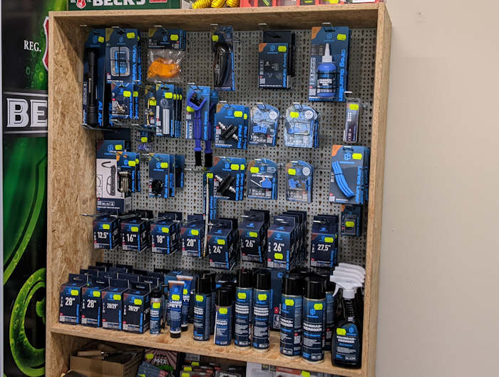 Als ich Ende November im Hornbach-Baumarkt hier im Stadtteil das Regal mit den Artikeln von Bike Broz gesehen hatte, war ich Feuer und Flamme. "Das brauche ich!", schoss es mir sofort durch den Kopf und so kontaktierte ich die Firma und wir kamen erfolgreich zusammen. Es hat zwar alles etwas gedauert, aber nun steht ein großer Teil des Sortiments von Bike Broz bereits hier im Regal. Es ist kein allgemeines Fahrrad-Sortiment sondern ist auf das Thema "Werkstatt" spezialisiert. Es geht also vor allem ums Reparieren und Pflegen. Die "allgemeinsten" Artikel sind daher tatsächlich ein paar Luftpumpen, Klingeln und Reflektoren. Ansonsten haben wir im Grunde sämtliche Schlauchgrößen da, Bremsklötze, diverse Artikel zur Reifenreparatur, Ventile und Ventiladapter und unterschiedliche Chemikalien, vom Pannenspray über Fette bis hin zu unterschiedlichen Reinigungsmitteln.