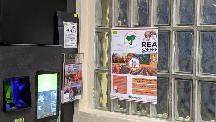 Für den REA-Weihnachtskaffee habe ich von der Rösterei einen Plakatentwurf bekommen. Außer bei uns in den Rahmen am Schaufenster haben wir auch einen Ausdruck an die Glasbausteine neben dem Leergutautomaten geklebt. Da weiß man dann direkt, was es mit der "abgestellten" Packung auf der Elepfandspendenbox auf sich hat.