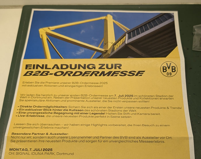 Vor ein paar Tagen trudelte hier ein etwas seltsames Schreiben ein: Ich habe eine Einladung zur B2B-Ordermesse von Borussia Dortmund erhalten. Keine Ahnung, ob das pauschal auch immer an alle Supermärkte und jegliche möglichen Verkaufsstellen verteilt wird, aber ich sehe mich da nun wirklich nicht als Kunde.