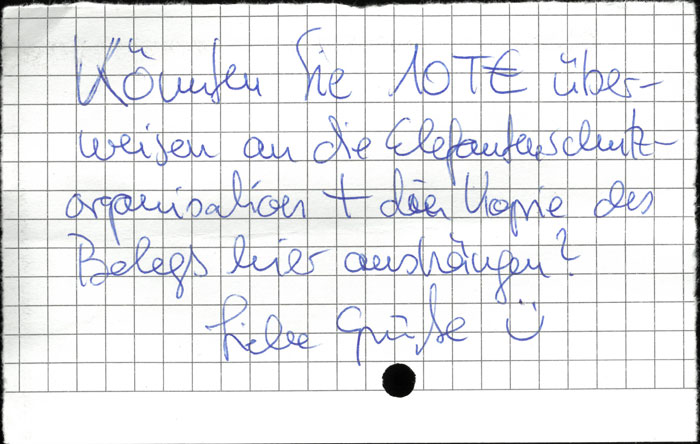 Bei der letzten Leerung der Elepfandspendenbox fiel mir dieser Zettel entgegen. 10.000 Euro am Stück (von meinem Geld, zumindest habe ich die Notiz so verstanden) habe ich leider gerade nicht über, um sie an die Eliprojekte abzutreten.