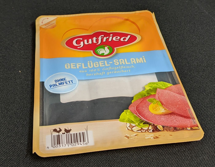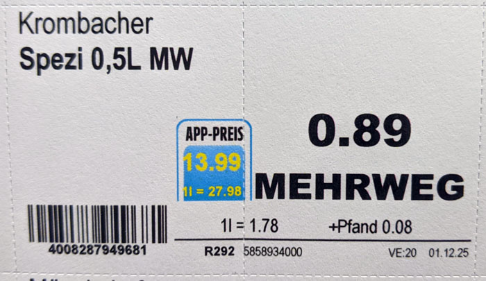 Wie diese rote (ja, sie ist rot, wenngleich sie mehr über ein Orange ins Gelbliche mit einem Hauch Grün am unteren Ende tendiert) Paprikaschote hier zu uns in die Gemüseabteilung gekommen ist, werden wir wohl nie erfahren. Ines hatte ein paar Artikel für zu Hause mitgenommen und scheint daher wirklich rein zufällig diese eine Frucht erwischt zu haben, die mit dieser Art Aufkleber versehen ist. Hat ein Kunde sie bei uns verloren? Hat beim Bauern jemand das falsche Etikettenpapier für die Aufkleber verwendet? Oder ist die Paprikaschote beim roten Mitbewerber ausgebüxt, um sich mal die blau-gelbe Welt anzusehen? Werden wir wohl nie erfahren. ;-)