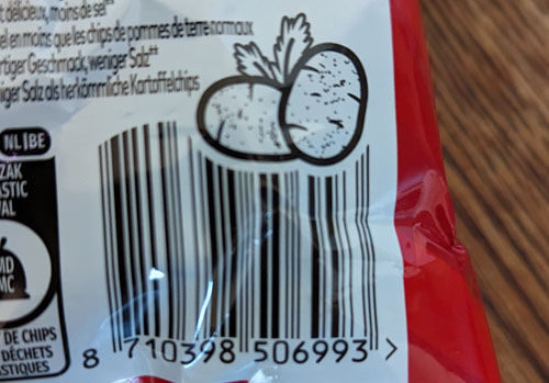 Diesen Strichcode mit zwei Kartoffeln hat Ines auf einer kleinen Tüte Lay's-Chips in der Sorte "Naturel" entdeckt, die wir irgendwann mal irgendwo im Ausland gekauft hatten. Wo das genau war, weiß ich jetzt auch selber schon nicht mehr. :-)
