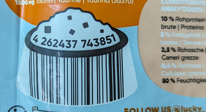 Auf den kleinen Tüten mit dem "Lucky Lou"-Katzenfutter prangt ein Strichcode in Form eines Futternapfes. Sehr passend.