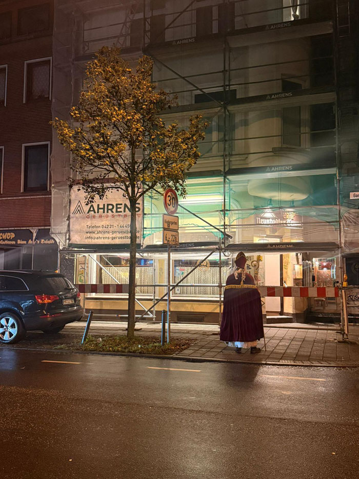 Da am Samstag Abend noch mal eben 50 Meter rüberzulaufen und ein paar Schnappschüsse für den Ahrens-Instagramkanal (Nur Story, ist schon wieder raus) zu machen, zwang sich da förmlich auf. Erkenntnis: Das Gerüst ist auch vom Nikolaus abgesegnet – obwohl er das hier selber gar nicht aufgebaut hatte. :-P
