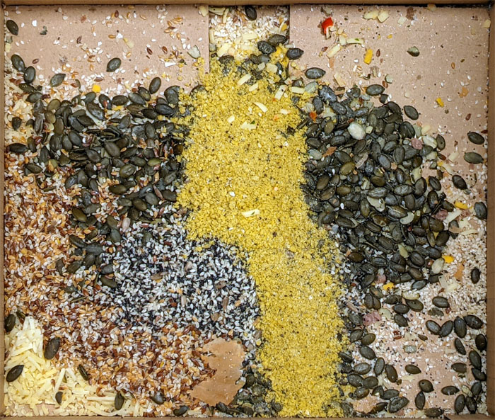 Inzwischen sind wir bei Teil 54 in dieser Reihe an außergewöhnlichen Ansichten oder wie sonst auch immer "kunstvollen" Bildern hier aus dem Laden. Beim morgendlichen Brötchenbacken hatte ich die Reste aus den Tüten und Folien, in denen die unterschiedlichen Produkte geliefert werden, in einem leeren Karton gesammelt. Das Ergebnis war eine Aneinanderreihnung von kleinen Schüttkegeln der unterschiedlichsten Brötchenbestreuungszutaten. Sah irgendwie interessant aus: