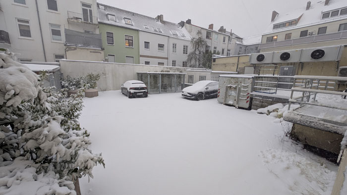 Der Weg heute früh hierher ging noch relativ geschmeidig, wie ich später nach Hause komme, wird sich zeigen. Mit dem neuen Auto mit Allradantrieb und Traktionskontrolle wird das vermutlich besser klappen als mit dem alten Diesel, aber spannend wird es trotzdem.