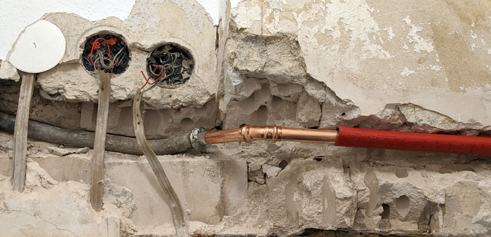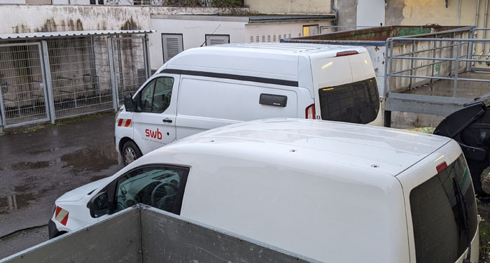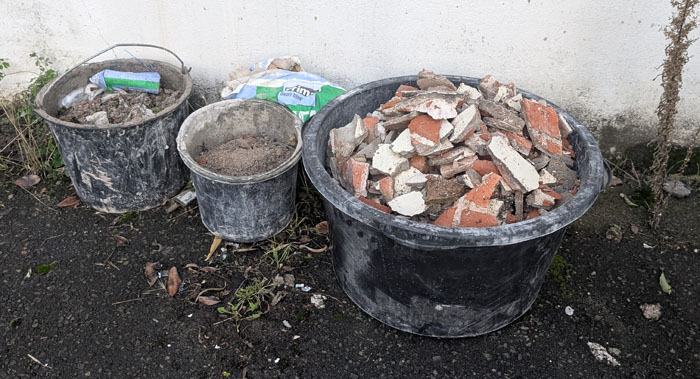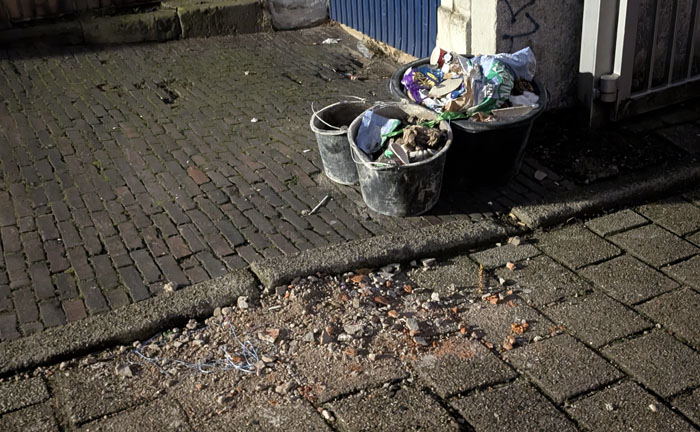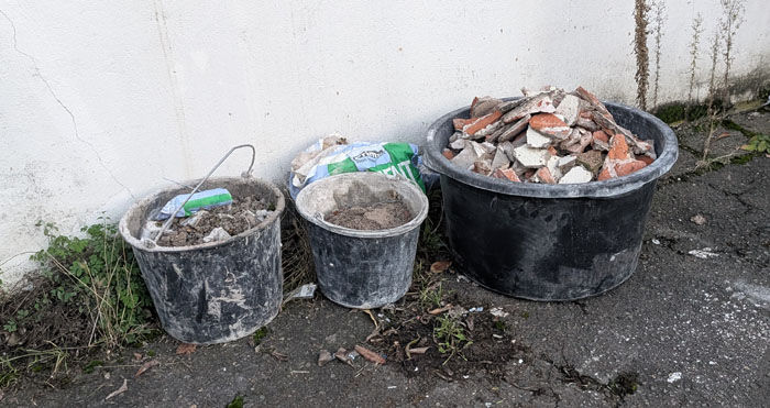 Die Behälter mit dem "vergessenen" Bauschutt hatte ich vor über einem Monat bereits von unserem Hof entfernt und neben die Garageneinfahrt des Hauses gestellt, an dem die Arbeiten von dem Maurer durchgeführt worden sind. Dabei hatte ich sogar eine Anwohnerin angetroffen, die der dort zuständigen Hausverwaltung Bescheid sagen wollte.