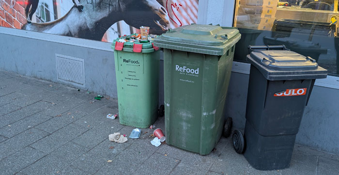 Kurz vor Weihnachten bekam ich einen Anruf vom Ordnungsamt Bremen. Am liebsten hätte die Anruferin wohl die Sache so gelöst, dass der mutmaßliche Urheber (also ich) die Tonnen entfernt. Aber da war ich raus, unsere Tonne stand auf dem Hof und wenn sie nicht ermitteln könne, zu welchem Betrieb die eigentlich gehören, sollte sie doch mal direkt bei ReFood anfragen und das melden. Wenn die nichts wüssten, wer dann?