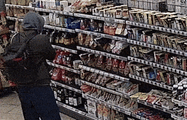 Das hätte auch einfacher und schneller gehen können, aber der Täter bevorzugte es, den korrekten Sitz seiner Beute innerhalb der Jacke mehrfach zu kontrollieren und erneut zu richten.