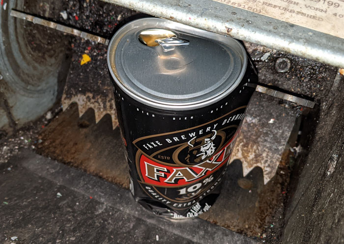 Die massiven Faxe-Dosen sind eine Herausforderung für Leergutautomaten. Unsere alten Kompaktoren bei den Trautwein-Geräten kamen bei den Dosen regelmäßig ins Schwitzen, der Cruncher in unserem Sivario (der nun übrigens auch schon fast 5 Jahre alt ist!) steckt die massiven Döschen etwas besser weg, aber auch dem hört man die Belastung an.