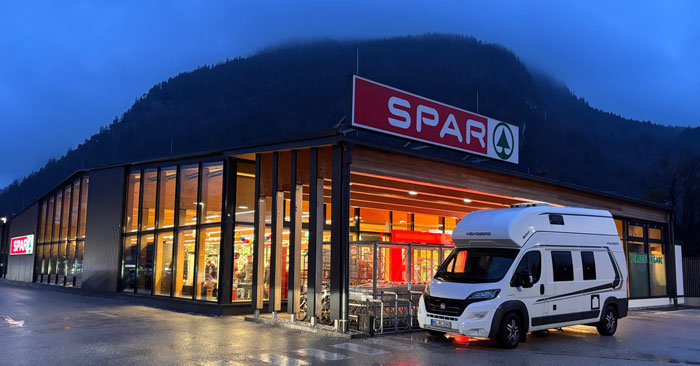 Diesen SPAR-Markt hatte Blogleser Michael während seines Skiurlaubs in Lofer in Salzburg/Österreich entdeckt. Ich konnte mich bei den beiden Bildern nicht für eines entscheiden, also gibt es beide Ansichten zu sehen. In der blauen Stunde mit eingeschalteter Beleuchtung und dem gewaltigen Berg im Hintergrund ist eigentlich das schönere Foto. Aber da steht halt das Wohnmobil im Weg.