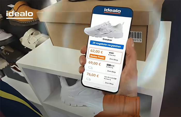 Und dann kommt ein Online-Preisvergleichsportal daher und macht Werbung, in der Leute in einem Schuhgeschäft den Strichcode eines Schuhkartons einscannen und dann in der Idealo-App direkt angezeigt bekommen, wo sie genau dieses Produkt online am günstigsten bekommen können.