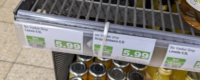 Man kann natürlich auch die durchgebrochene und daher herunterhängende Preisschiene mit einem Stückchen Band fixieren. Der Arbeitsaufwand dafür mag geringfügig geringer als beim kompletten Austausch der Schiene sein, aber dafür sieht es auch ein bisschen bescheuerter aus …