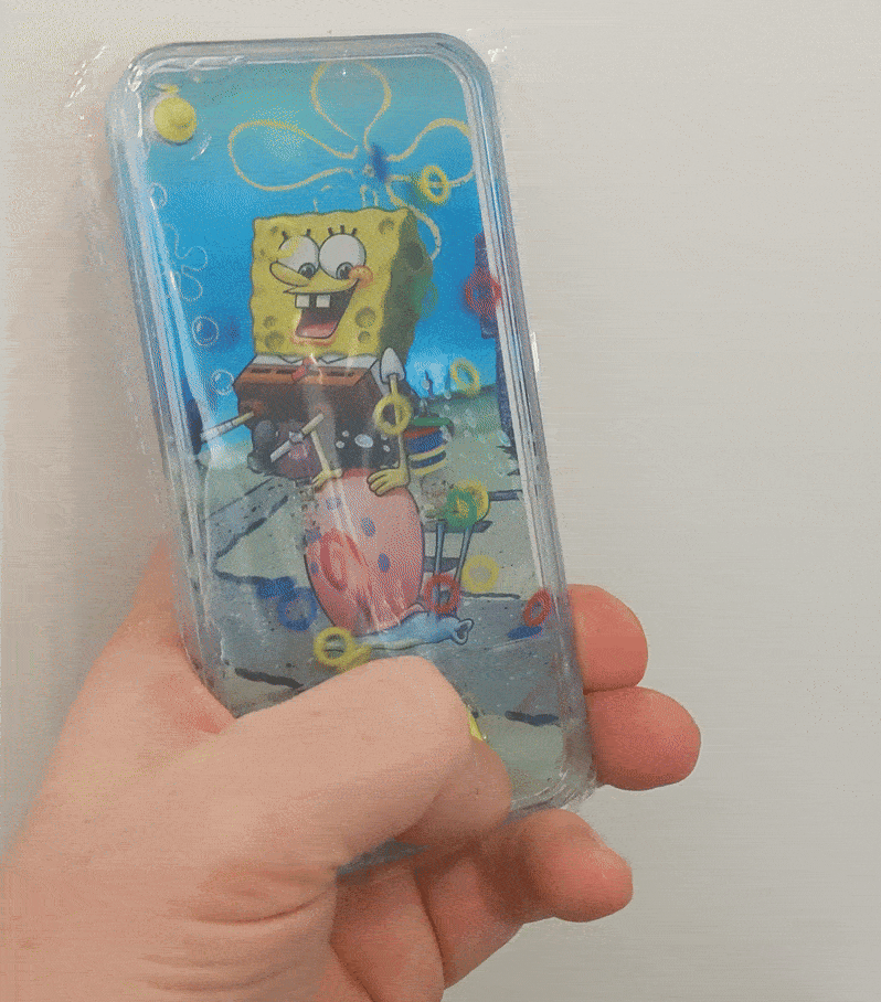 Von einer Zeitarbeitsfirma, mit der wir nicht zusammenarbeiten, gab es ein kleines Päckchen mit Infomaterial und Werbegeschenken. Unter anderem ein Spongebob-Geduldspiel, ein klassisches Wasserspiel, bei dem man kleine Ringe in ein Ziel bringen muss.