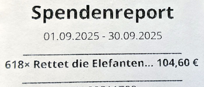 Über die Spendenfunktion unseres Leergutautomaten sind im vergangenen Monat übrigens 104,60 € für die Arbeit des David Sheldrick Wildlife Trust zusammengekommen. Das Geld reicht gerade, um ein Elefantenbaby drei Tage mit Milchnahrung zu versorgen, aber es ist immerhin bislang die größte Summe, die wir innerhalb eines Monats auf diese Weise dem Spendenkonto hinzufügen konnten.