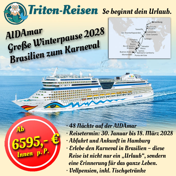 Winter in Deutschland, Samba im Kopf. Während hier die Finger am Kaffeebecher festfrieren, gleitet die AIDAmar in Richtung Sonne – und du gleich mit. Ohne Flughafen-Stress, ohne Handgepäck-Tetris im Flieger: Einfach in Hamburg an Bord gehen und ein paar Tage später in Südamerika wieder auftauchen.