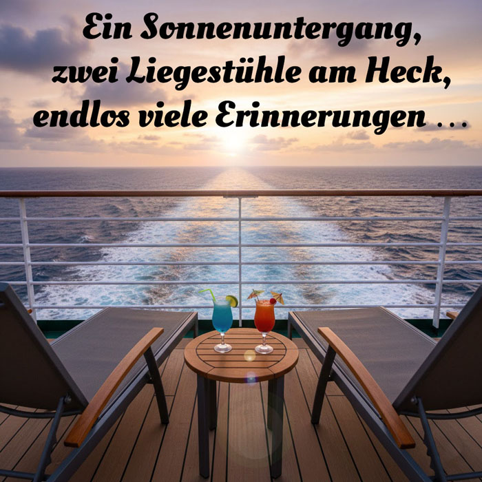 Ich könnte stundenlang auf die Heckwelle eines Schiffes gucken, während ich mir genüsslich den einen oder anderen Cocktail einverleibe. Warum mich dieser Anblick so fasziniert, kann ich nicht sagen – aber die Kombination aus der Monotonie im Großen und dem sich doch unentwegt verändernden Bild der Wellen und Wolken muss eine hypnotisierende Wirkung haben.