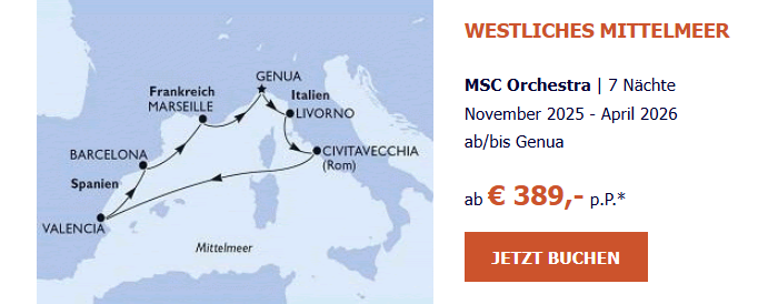 Natürlich müsste man die Anfahrt nach Genua noch selber organisieren. Aber wer da aus welchen Gründen zum passenden Zeitpunkt ohnehin in der Nähe ist, hat hier die Chance auf eine supergünstige Kreuzfahrt: 7 Nächte im Mittelmeer auf der MSC Opera für unter 400 Euro in der Innenkabine – das schlägt so schnell wohl niemand wieder.