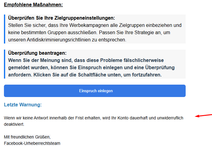 Wer auch nach dem zigdutzendsten Anschreiben dieser Art noch immer nicht verstanden hat, um was es (nicht) geht und auf den Button "Einspruch einlegen" klickt, landet auf einer Seite im Facebook/Meta-Design, aber natürlich auf einem fremden Server. Wer dann auch noch seine Kreditkartendaten und/oder vor allem die kompletten Zugangsdaten für den Facebook-Account dort eingibt, hat es eigentlich gar nicht besser verdient, als abgezockt zu werden.