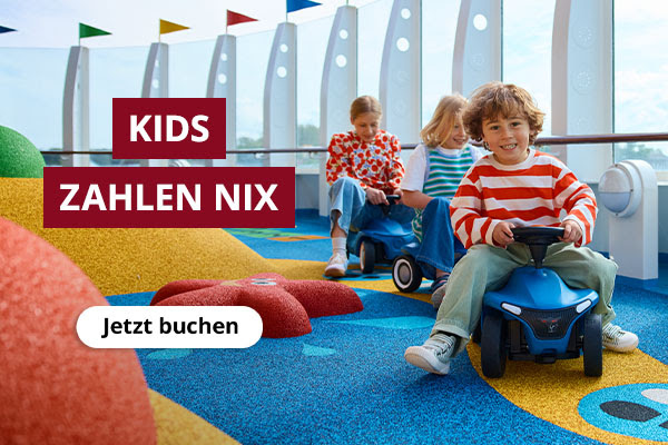 Sommer-Aktion 2026 von AIDA: "Kids zahlen nix" – und zwei bei einer Buchung bis zum 05.11.2025 ist die Kreuzfahrt für Kids unter 16 Jahren im 3., 4. und 5. Bett gratis.