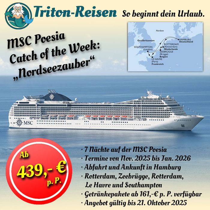 Der neueste Catch-of-the-Week von MSC Cruises führt euch von Hamburg aus sieben Nächte lang auf der Nordsee zu diversen Küstenmetropolen. An Bord der MSC Poesia könnt ihr während einer sieben Nächte dauernden Reise ab Hamburg die Städte Rotterdam, Le Havre, Zeebrügge und Southampton entdecken. Die Abfahrten sind zwischen Anfang November 2025 bis Ende Januar 2026 und sind größtenteils für teilweise sogar deutlich unter 500 Euro pro Person in der Innenkabine zu bekommen.
