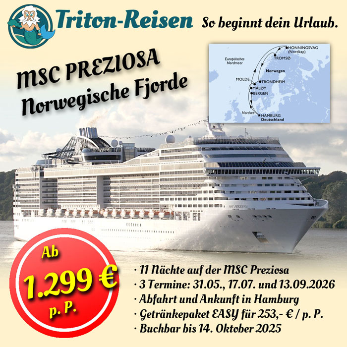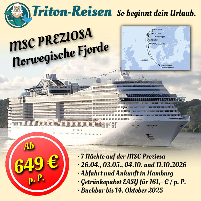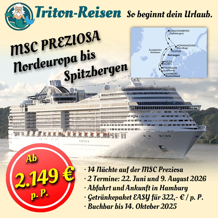 Wow, was für eine Kreuzfahrt: Auf der schönen MSC Preziosa, mit der wir selber auch schon gefahren sind, geht es nächsten Sommer