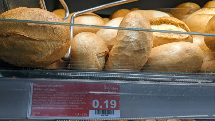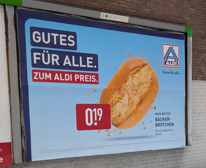 Mitten in der Stadt fiel mir eine große Plakatwand auf. Auf dem Plakat war ein Aldi-Brötchen zu sehen, das fett mit dem Aldi-Preis beworben wurde. 19 Cent. Hammer. Dafür macht Aldi öffentliche Werbung auf jeweils knapp acht Quadratmetern. Und ich wette, alle rennen da hin, weil Aldi günstig ist.
