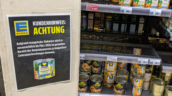 Seit einer Weile leerte sich unser Regal mit Ananas immer weiter, Nachschub kam nicht. Dass Artikel mal nicht lieferbar sind, kommt vor, aber dass dies für eine komplette Warengruppe zutrifft, ist doch eher selten. Außer wir stecken mal wieder in einer Preisverhandlung mit einem Lieferanten, aber die dürften bei Discount-Konserven eher nicht zutreffen.