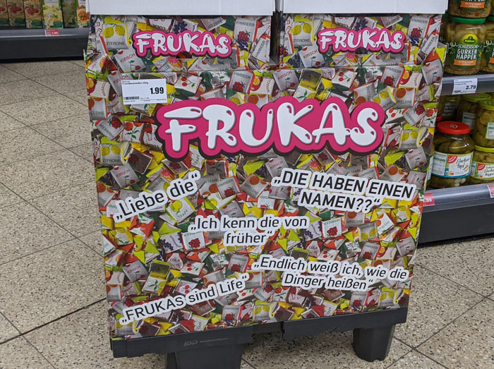 "Die haben einen Namen?", ja haben sie. Aber "Frukas" habe ich noch nie gehört gehabt, aber meinetwegen, dann sollen sie eben ab jetzt "Frukas" heißen. Für mich bleiben es "Fruchtkaramellen".
