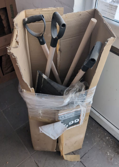 Eher zufällig hatte ich bei uns in der Halle noch einen alten Karton mit Schneeschiebern gefunden. Wir hatten die mal vor Jahren im Angebot und ich vermute, als wir für den Umbau Platz brauchten, hatten wir sie mit zur Halle genommen. Es waren ja auch nur noch vier Stück und so gerieten sie in Vergessenheit.