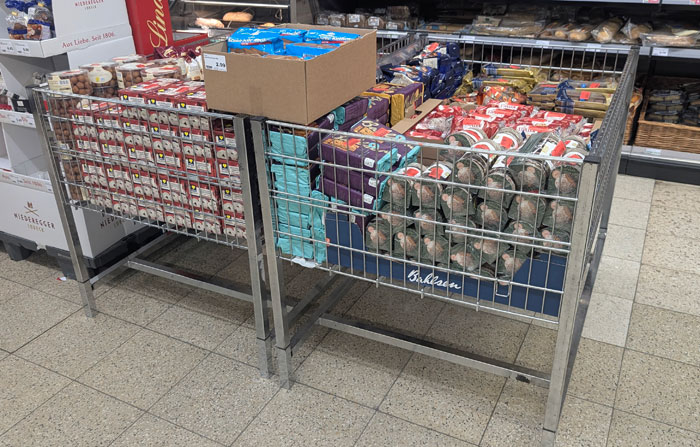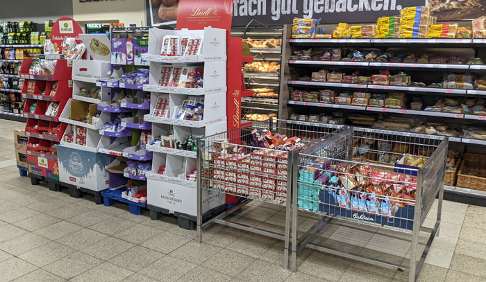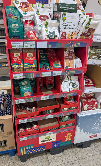 Wirklich erstaunlich war diesmal, dass ein Aufsteller mit Bio-Weihnachtssüßwaren von Alnatura gefühlt noch fast vollständig hier steht. Klar, auch diese Produkte sind teurer geworden, aber sonst haben wir die Bio-Produkte hier immer richtig gut verkauft und wenn man mit den letzten Jahre vergleicht, hätte dieses Display eigentlich längst leer und aufgelöst sein sollen.
