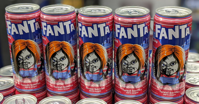 Als ich diese Fanta-Dosen bei Coca-Cola bestellt hatte, dachte ich, dass eventuell ein neuer Chucky-Film ins Kino kommt. Wäre ja nicht so ungewöhnlich, immerhin gibt es schon acht Teile – aber, nein, so ist es nicht. Diese Dosen sind einfach nur eine Sorte neben anderen Fanta-Halloween-Designs. Das könnte den Absatz doch etwas schmaler gestalten, als ich zunächst angenommen hatte.