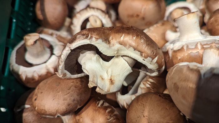 Kurioses Fundstück von Ines in der Gemüseabteilung: Zwischen den losen Champignons lag ein Exemplar (oder waren es tatsächlich zwei?), mit zwei Stielen, die oben jeweils in ihrem eigenen Hut endeten – die beiden Hüte waren jedoch zu einem großen zusammengewachsen.