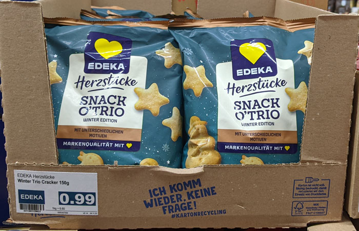 Es sind Cracker (Salzgebäck) unserer Eigenmarke in unterschiedlichen Formen. Da ich den Artikel schon interessant fand, wir aber bei der Bestellung überhaupt keine Ahnung hatten, woher hätte diese auch kommen sollen, wie sie laufen könnten, hatten wir uns nur für einen einzigen Karton entschieden. Die 14 Tüten werden wir schon los, da bin ich sicher. 99 Cent pro Tüte ist jedenfalls absolut fair, finde ich.