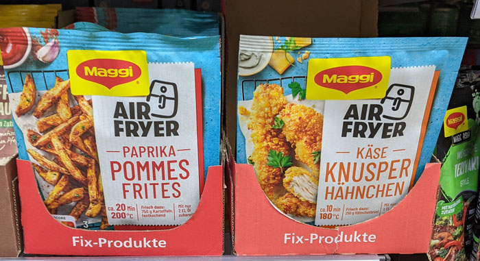 Obwohl die Fix-Produkte im Allgemeinen (Maggi wie Knorr gleichermaßen) zumindest bei uns hier eher ein sterbendes Segment sind, das wir im Laufe der Jahre auch immer weiter verkleinert haben, sind in den letzten Tagen doch wieder ein paar neue Produkte dazugekommen. Heißluftfritteusen, Neudeutsch: "Air Fryer", werden immer beliebter, selbst wir haben zu Hause so ein Teil seit ein paar Jahren stehen.