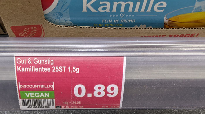 Auf dem neuen Preisschild, das unser System für den Kamillentee ausgespuckt hat, prangt der deutlich erkennbare Hinweis, dass das Produkt vegan ist.